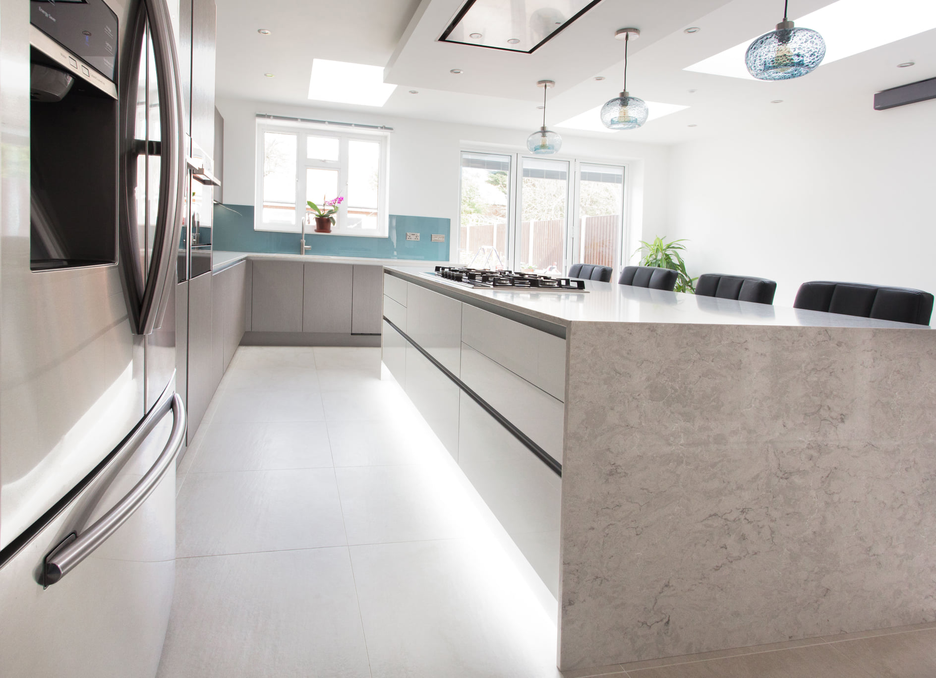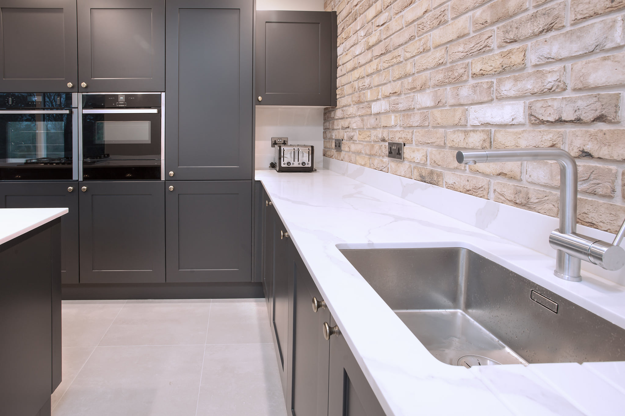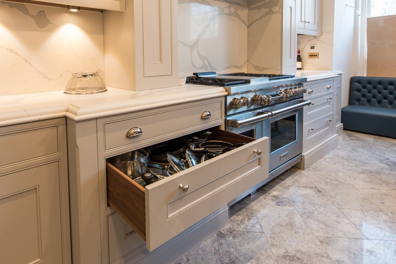 Our latest kitchen marble work features a stunning white Carrara marble worktop with grey veining that complements the modern aesthetic of the kitchen. The bespoke design maximizes functionality while adding a touch of luxury to the space. The result is a beautiful and practical kitchen that exceeds expectations.